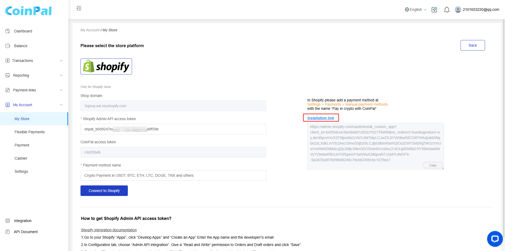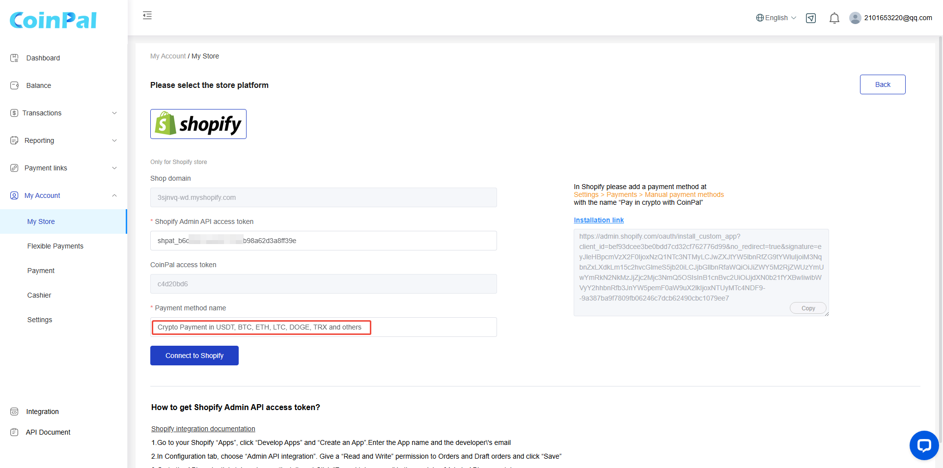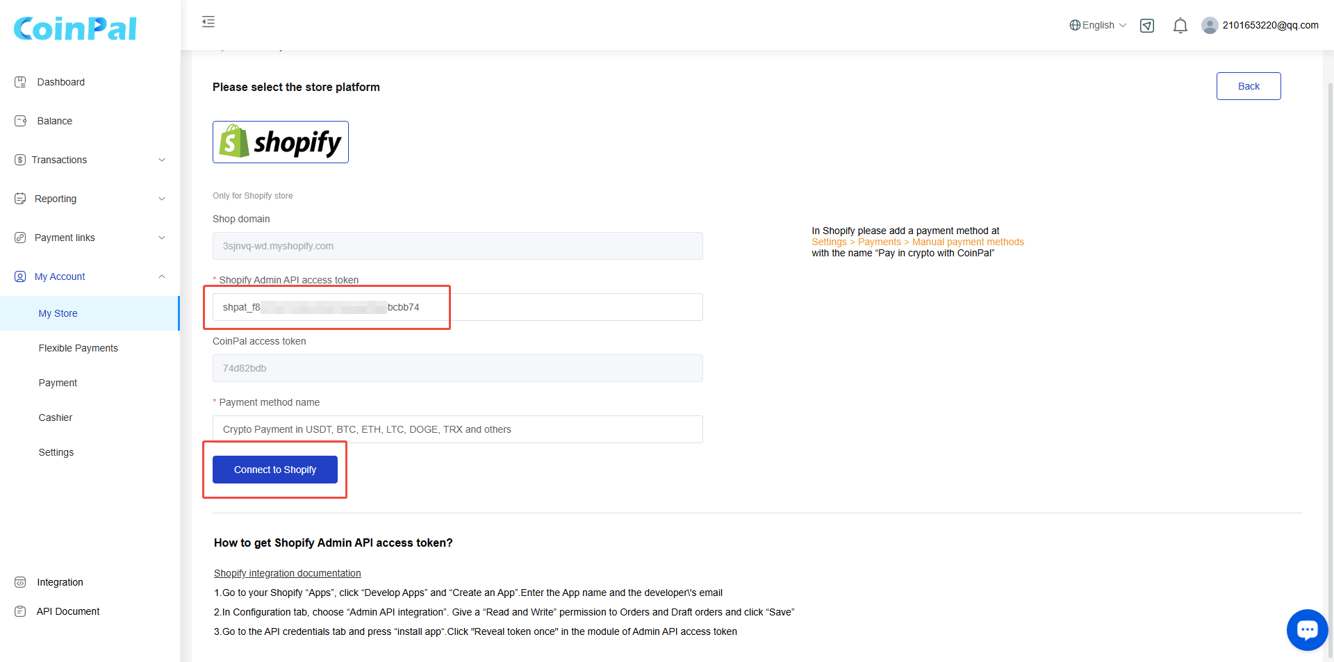 Step 4: Go to your CoinPal Account > My Account > My Store > choose/add store & click "Configuration" > click"Shopify" and fill the fields using the info from the Shopify API credentials tab (access token)