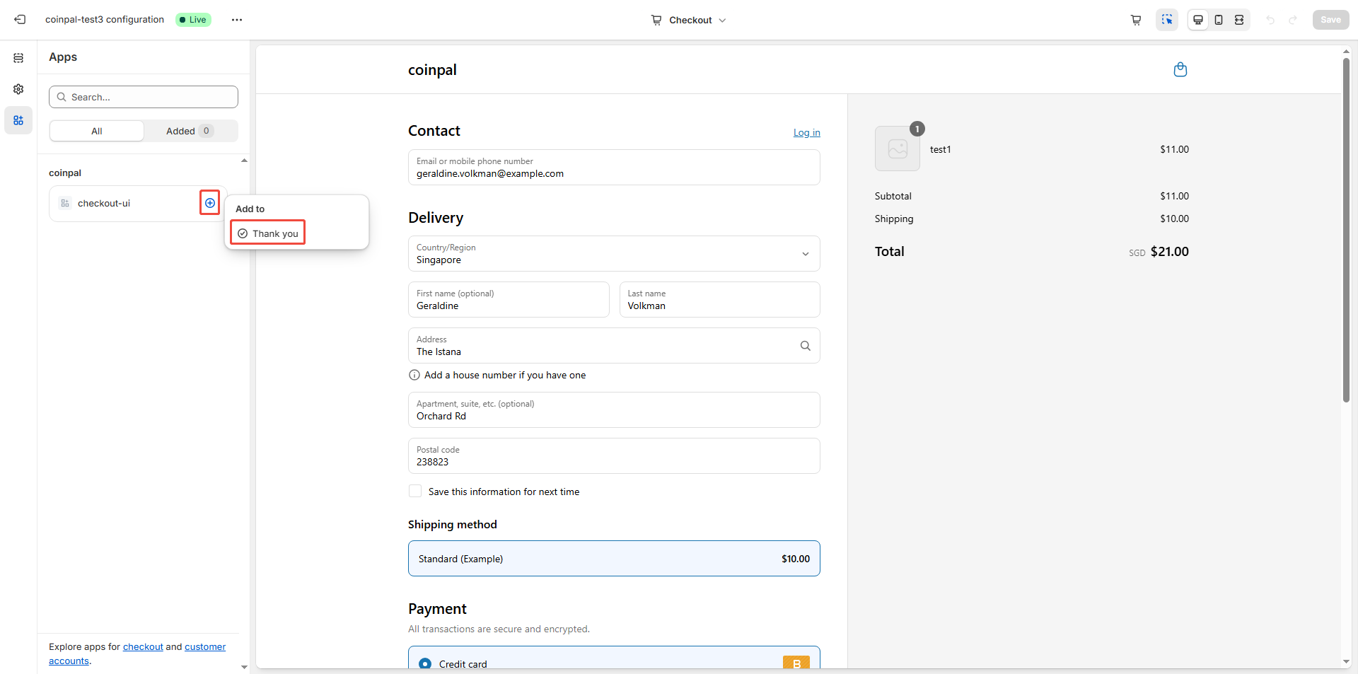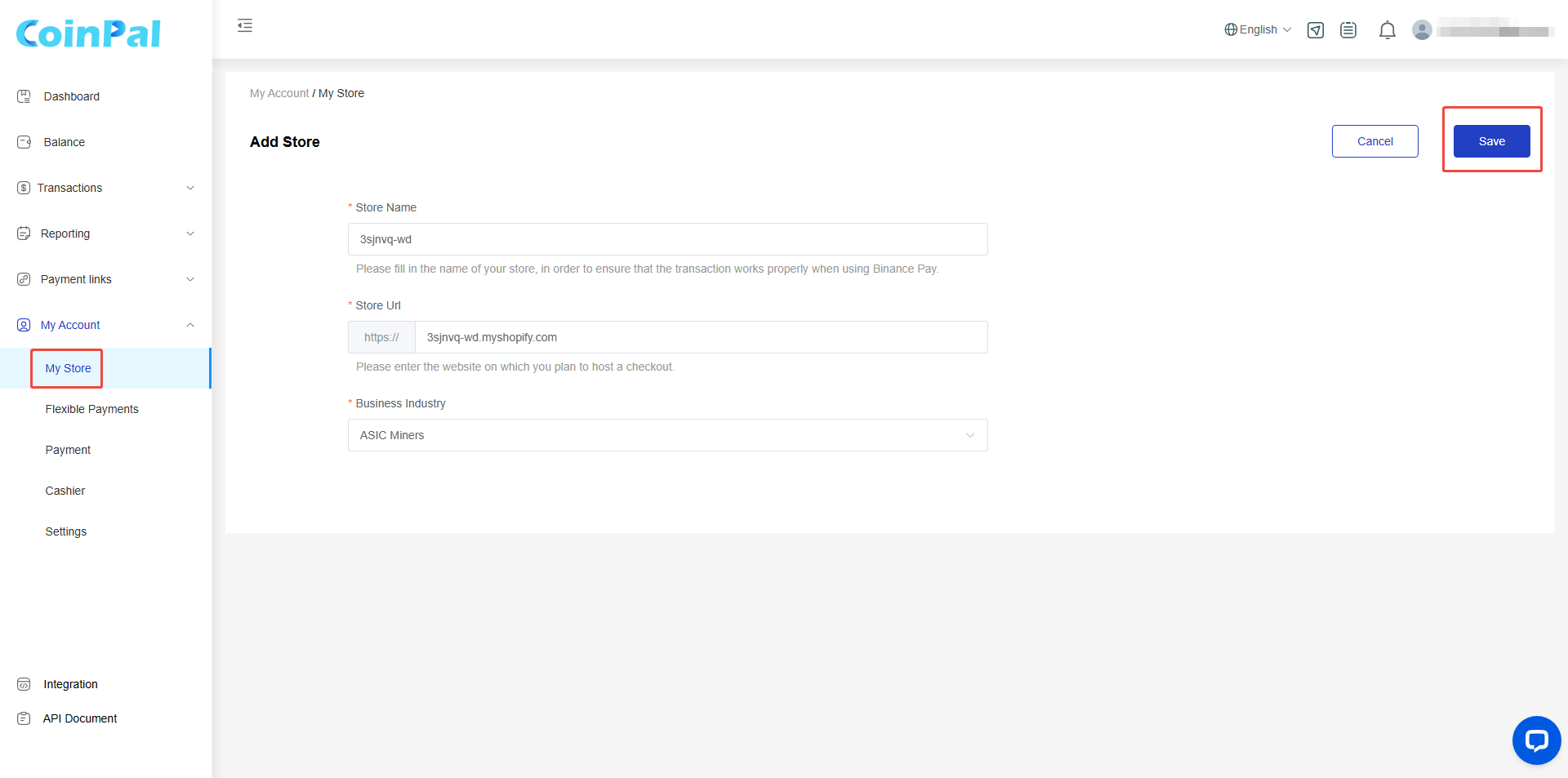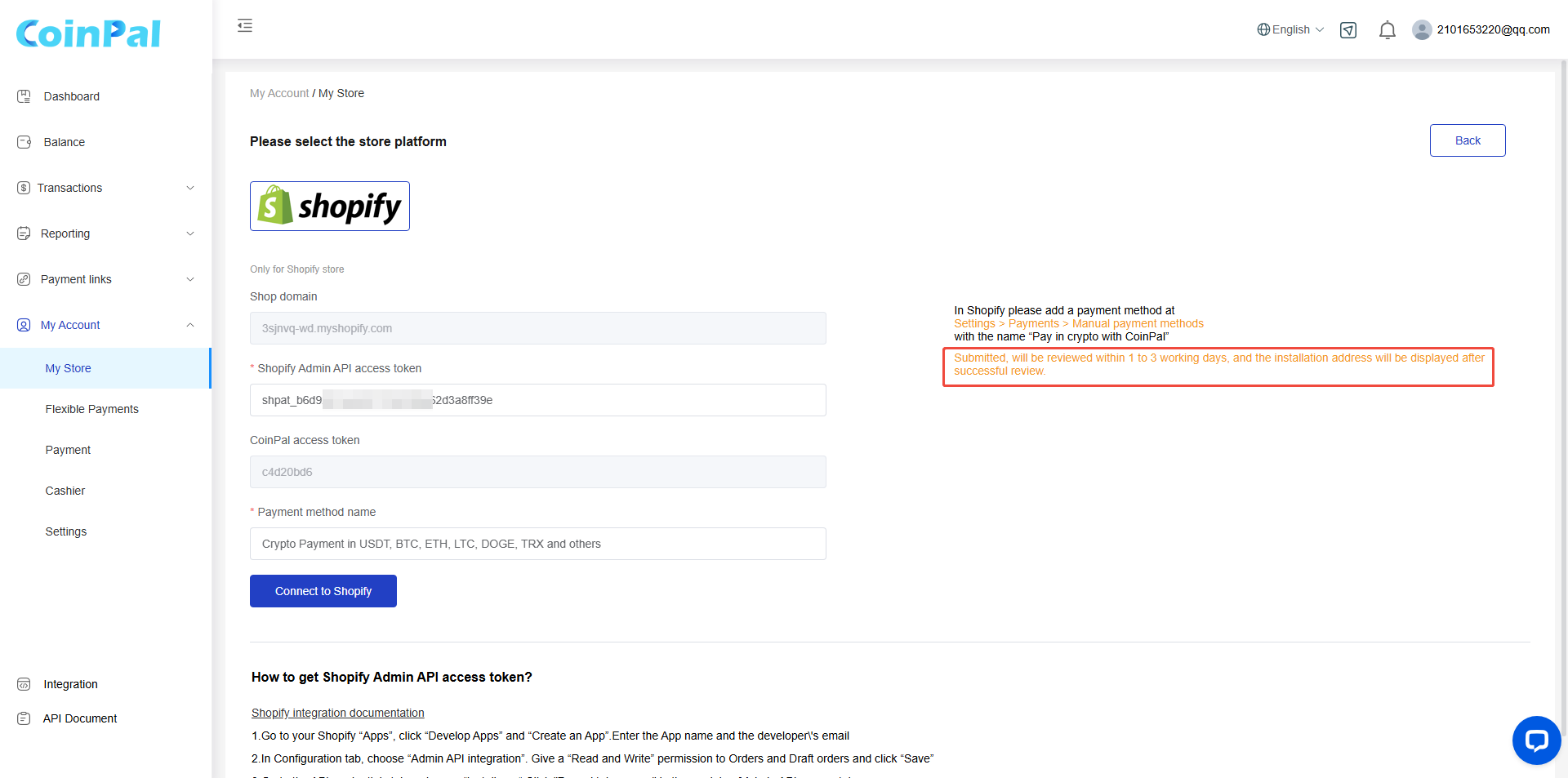 Step 4: Go to your CoinPal Account > My Account > My Store > choose/add store & click "Configuration" > click"Shopify" and fill the fields using the info from the Shopify API credentials tab (access token)