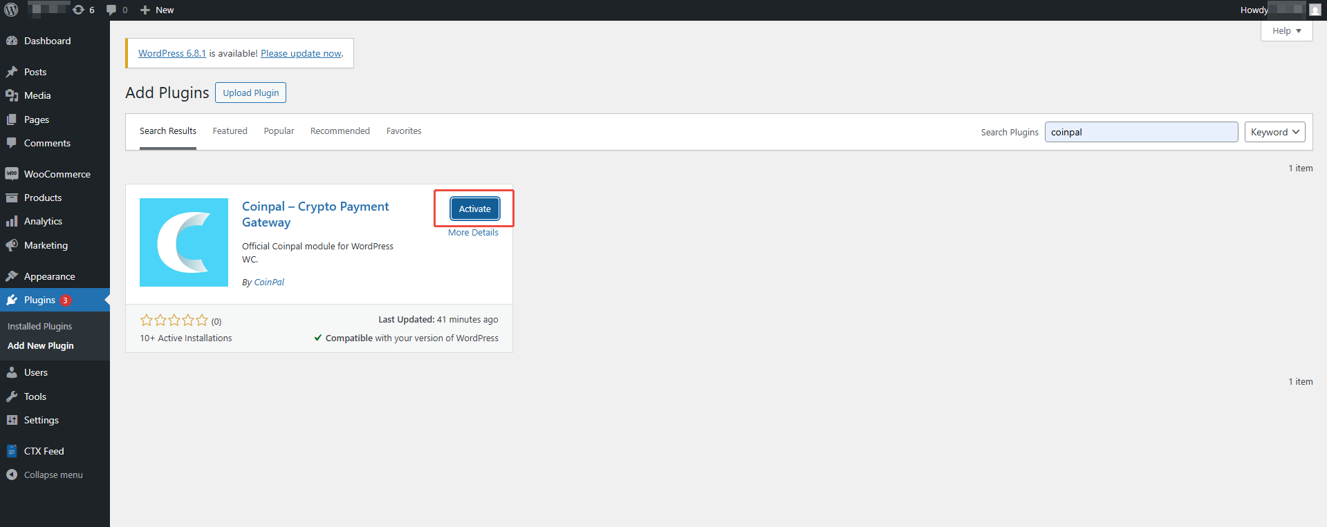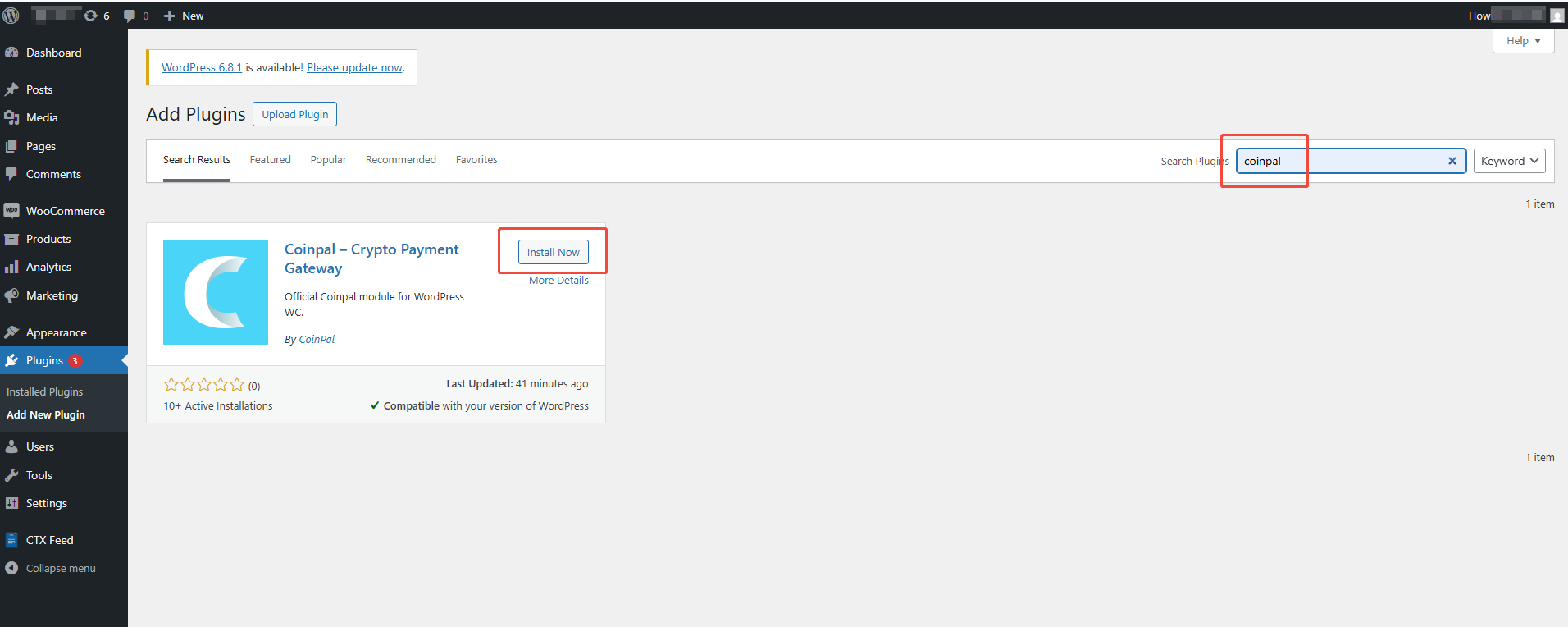 Note: Before installing the "Coinpal - Crypto Payment Gateway", please ensure that WooCommerce is installed and activated. If it is not yet installed, follow the same steps below to search for "WooCommerce", then click Install Now and Activate.